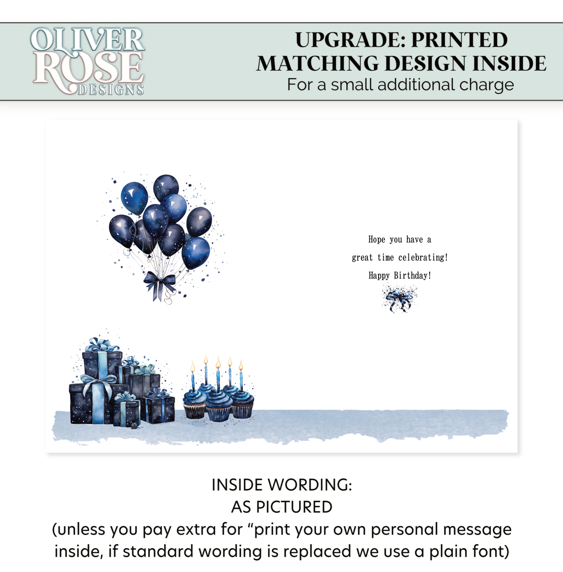 • Printed Personal Message Inside - When this option is selected we will override the standard wording inside (shown in photo no 2) with your own words instead (printed in a plain font).